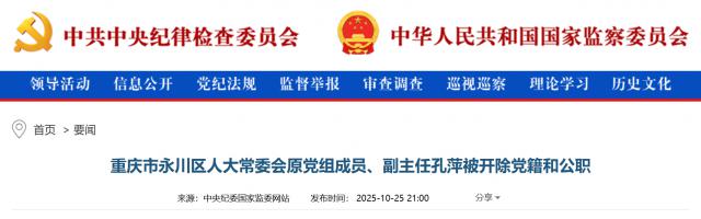 据重庆市纪委监委 10 月 25 日晚消息:经重庆市委批准恒信期货,重庆市纪委监委对永川区人大常委会原党组成员、副主任孔萍严重违纪违法问题进行了立案审查调查。