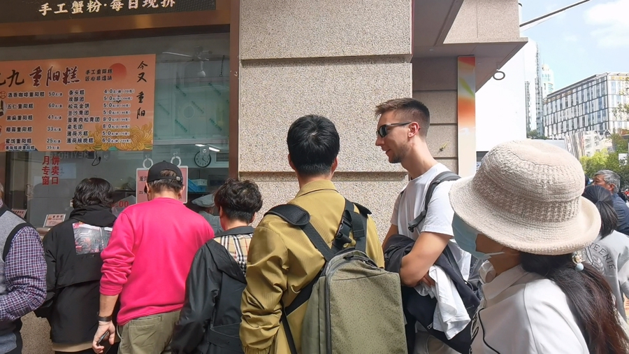 宪杰带汤姆在南京路步行街体验排队购买重阳糕。