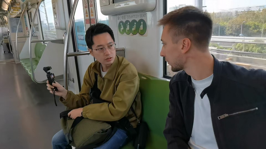 前往市区的路上,宪杰为汤姆介绍着窗外的磁浮列车、高架桥,一路所见都会成为他们的话题。汤姆刚刚博士毕业,此次中国之行是他送给自己的礼物。面对“光伏板”等专业词汇,以及“外滩为什么叫the bund”的发问,宪杰熟练地查询着翻译软件,然后拿给汤姆看。他们也聊起在各自的国家,年轻人面临什么样的社会压力。